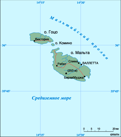 Республіка Мальта (мальт. Repubblika ta' Malta, англ. Republic of Malta), країна на острові в Середземному морі до півдня від Сицилії, на схід від Тунісу і півночі від Лівії; площа 320 кв. км; столиця і порт Валетта; рельєф: гористий, включає також острови Гоцо 67 кв. км і Коміно 2,5 кв. км; політична система — ліберальна демократії; недавня історія: анексована Англією у 1814, одержала самоврядування в 1947, повна незалежність досягнута в 1964.
